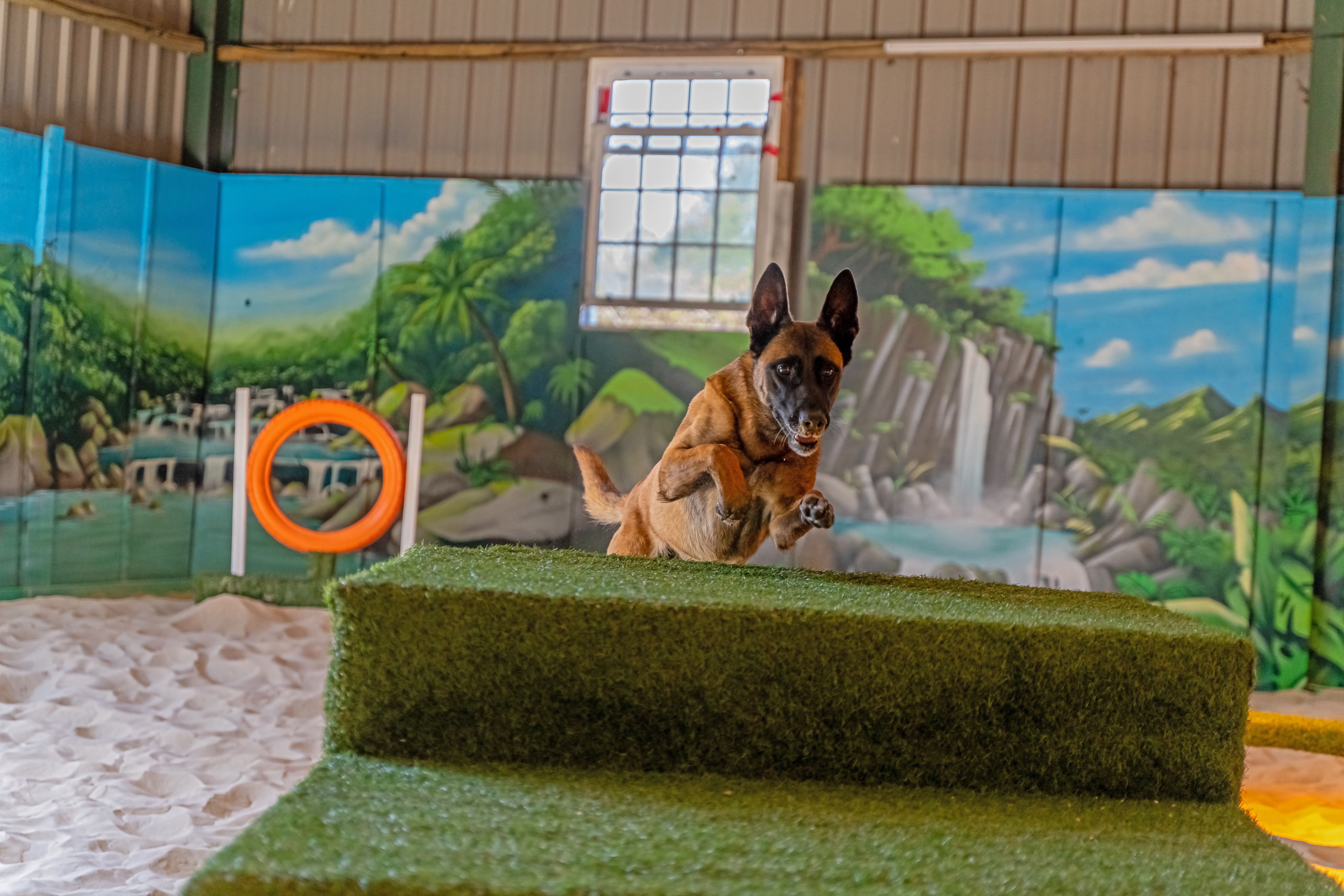 We engaged a local artist to create a unique and immersive space to transport you and your dog to a stunning beach or jungle setting. Perfect for getting some great photos!